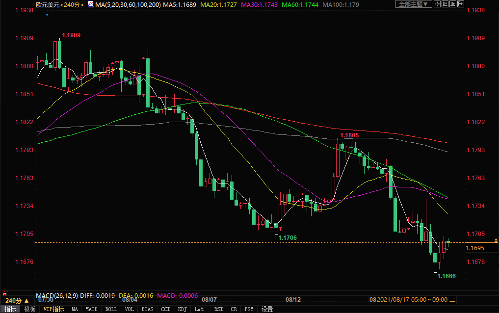 北京时间8月19日21:40,欧元兑美元报1.1696/98。