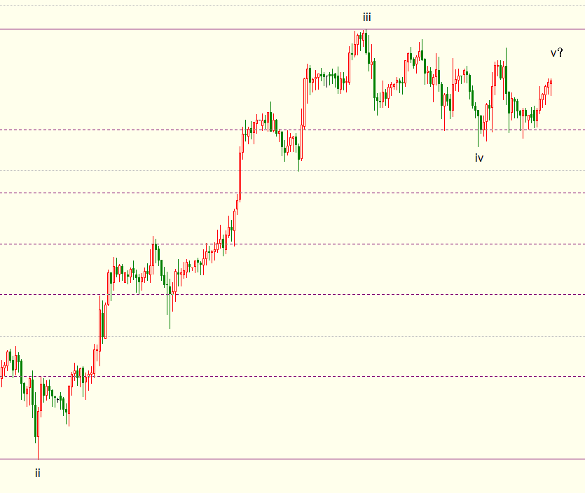 小时图上看,金价自处于自1796美元开启的下行iv浪,但在1777美元附近获得支撑,后者是始于1718美元的iii浪的23.6%斐波那契回档位。若金价自1774美元开启上行v浪,后市料重返1800美元上方。iii浪和iv浪都是自1680美元开启的上行(i)浪的子浪,(i)浪是同样自1680美元开启的上行((i))浪的子浪。