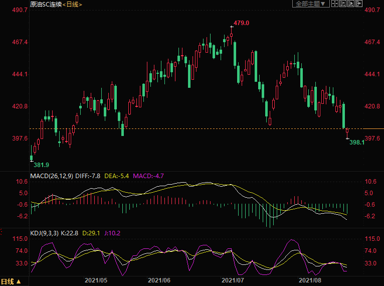 周五(8月20日)上海原油价格下跌,收于三个月低位,主力合约2110终盘收于405.3元/桶,跌9元/桶,跌幅2.17%,因担心随着新病例数攀升,全球需求将减弱,同时美元走高。