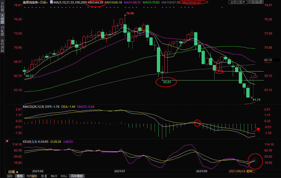 下方初步支撑在7月20日低点65.00关口附近,5日均线支撑在66.17附近,失守该位置前,短线偏向多头,如果失守该位置,则需要提防重回跌势的风险。