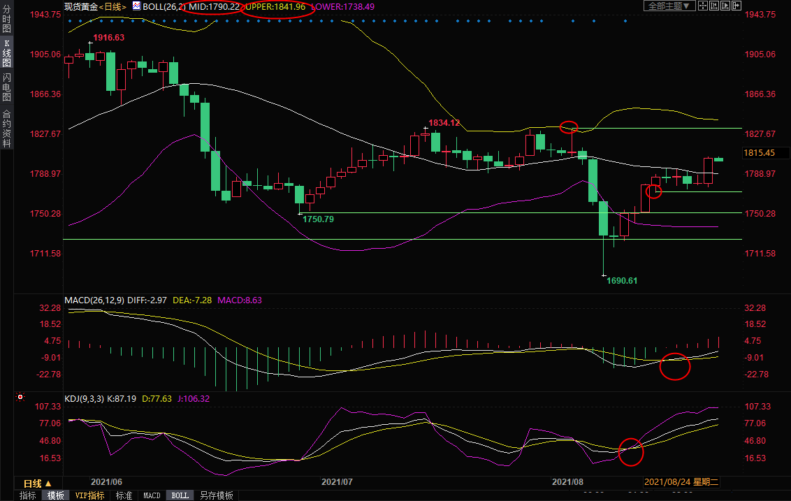 不过,短线的话,200日均线1811.15附近也还存在较强的阻力,100日均线阻力也在该位置附近,如果持续受阻于该位置,需要提防金价重回跌势的风险。初步支撑在布林线中轨1790.25附近,10日均线支撑在1781.56附近;8月16日低点支撑在1770.93附近。