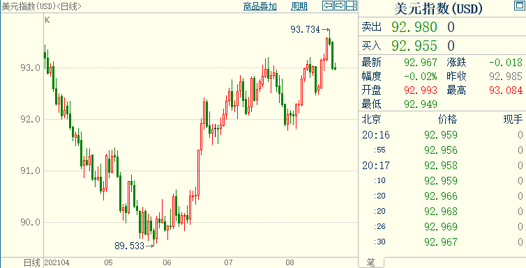 北京时间20:16,现货黄金上浮0.11%至1807.31美元/盎司;COMEX期金主力合约上涨0.18%至1809.5美元/盎司;美元指数下沉0.02%至92.959。