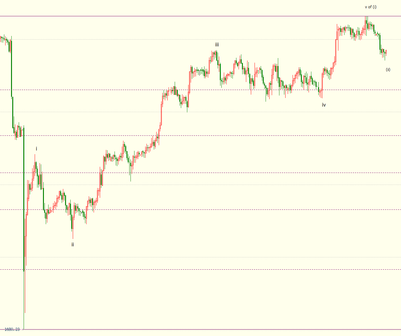 小时图上看,金价自1810美元开启回调(ii)浪走势,下方支撑看到1779美元,它是自1680美元开启的上行(i)浪的23.6%斐波那契回档位。(i)浪是同样自1680美元开启的上行((i))浪的子浪。