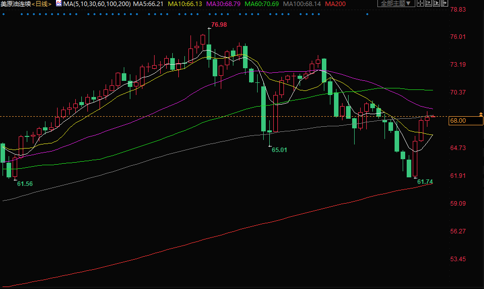 北京时间8:25,美原油现报67.94美元/桶。