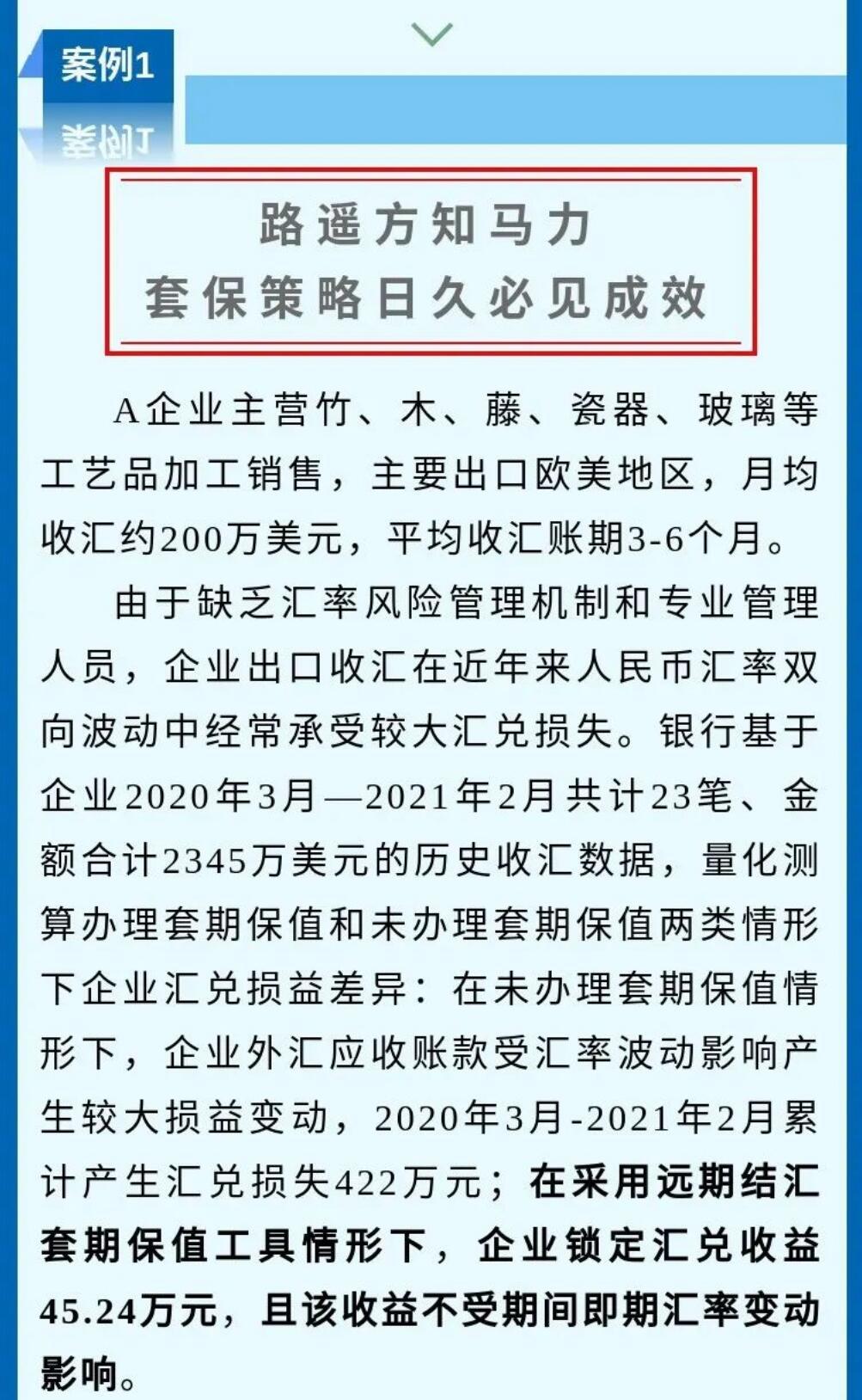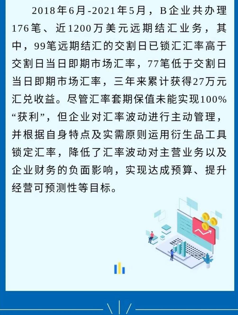 一张图系列--汇率避险经验之中小微企业篇 2021-08-26 15:29 据国家外汇管理局网站8月17日报道:由于缺乏汇率风险管理机制和专业管理人员,企业出口收汇在近年来人民币汇率双向波动中,经常承受较大的损失。基于银行的测算,企业认识到持续套期保值策略,对中长期财务稳健的改善作用……制作:国家外汇管理局福建省分局