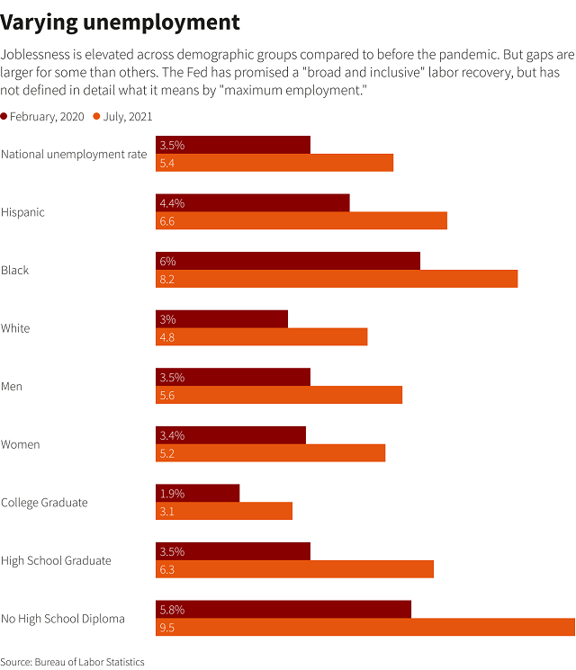 说到通胀过度,“适度”是什么意思?经济能在多大程度上重现疫情前的状况?比如,当时非裔美国人的失业率创历史新低,就业或正在找工作的成年人比例稳步上升。2020年1月,劳动力参与率达到63.4%。现在是61.7%。2019年8月,黑人失业率创下5.2%的历史新低,即使在那时,也比白人高1.8个百分点。截至7月,这一比例为8.2%,而白人为4.8%。
