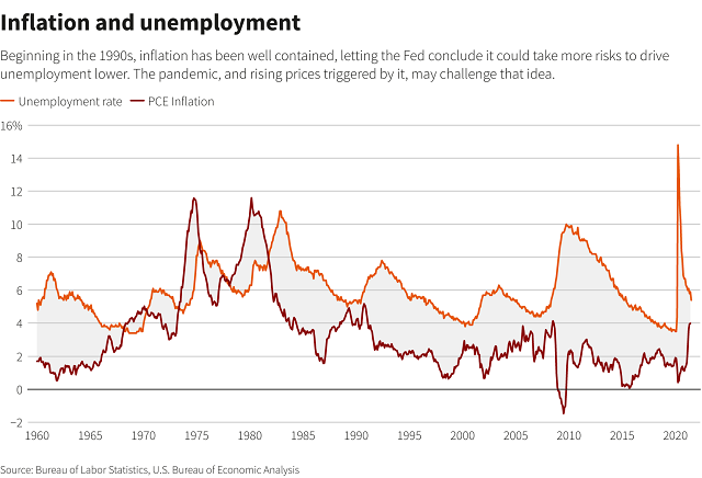在2007年至2009年的经济衰退后的10多年的经济扩张中,这种关系并不成立。随着失业率下降,通胀保持温和,美联储官员得出结论,他们可以利用这一点,承担更大的通胀风险,创造有利于穷人的“火热”经济和强劲的就业市场。