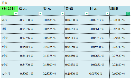 1个月LIBOR:欧元报-0.57800%,美元报0.08463%,英镑报0.05325%,日元报-0.06833%,瑞郎报-0.79240%。