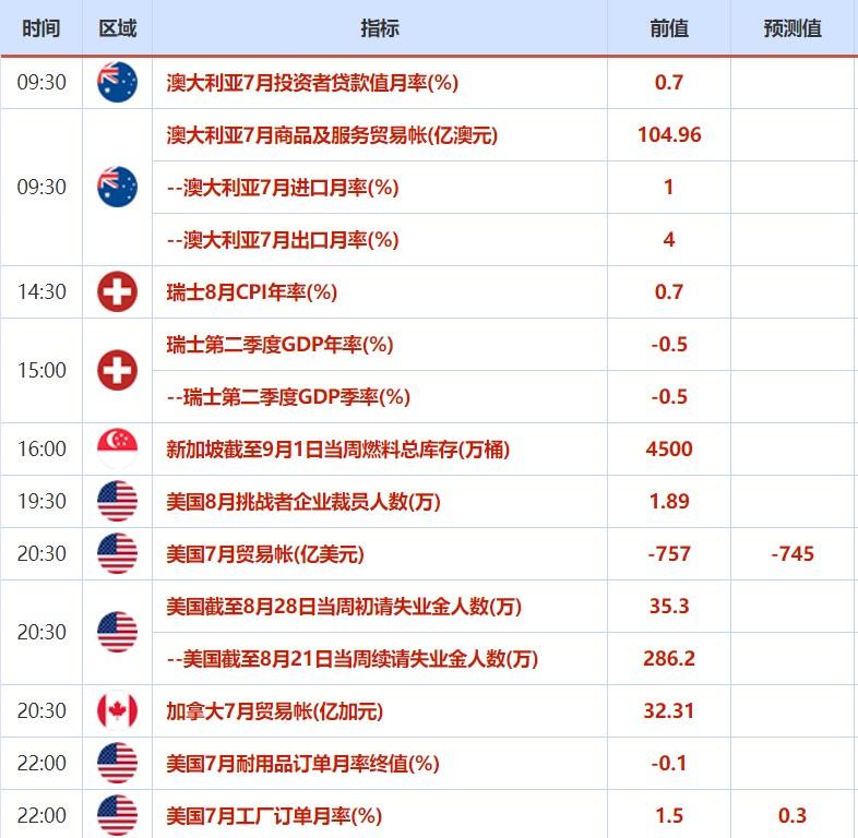 9月2日周四关键词:美国7月贸易帐,初请失业金人数变动