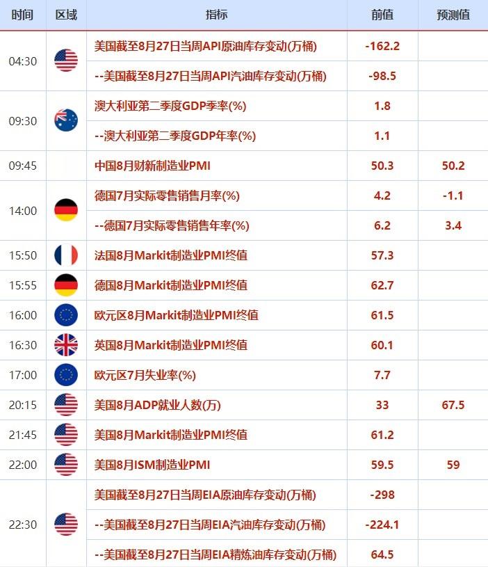 周二(8月31日)关键词:中国8月官方制造业PMI,欧元区CPI数据