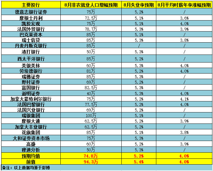 25家大型投行预测显示,主要投行对8月非农就业人口的增幅预期差距较大,具体而言,美国8月季调后非农就业人口增幅料介于40万-100万,失业率料介于5.1%-5.3%,平均时薪年率增幅料介于3.6%-4.1%。