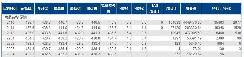 上海原油价格上涨,主力合约2110终盘收于446.5元/桶,涨6.8元/桶,涨幅1.55%。