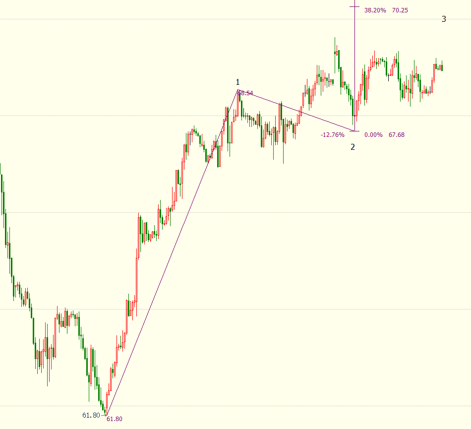 日线图上看,美油处于自61.74美元开启的上行((3))浪,上方近期目标看向14.6%目标位72.03美元。小时图上看,油价自67.68美元开启上行3浪走势,后市料升破38.2%目标位70.25美元,并进一步升向61.8%目标位71.85美元。