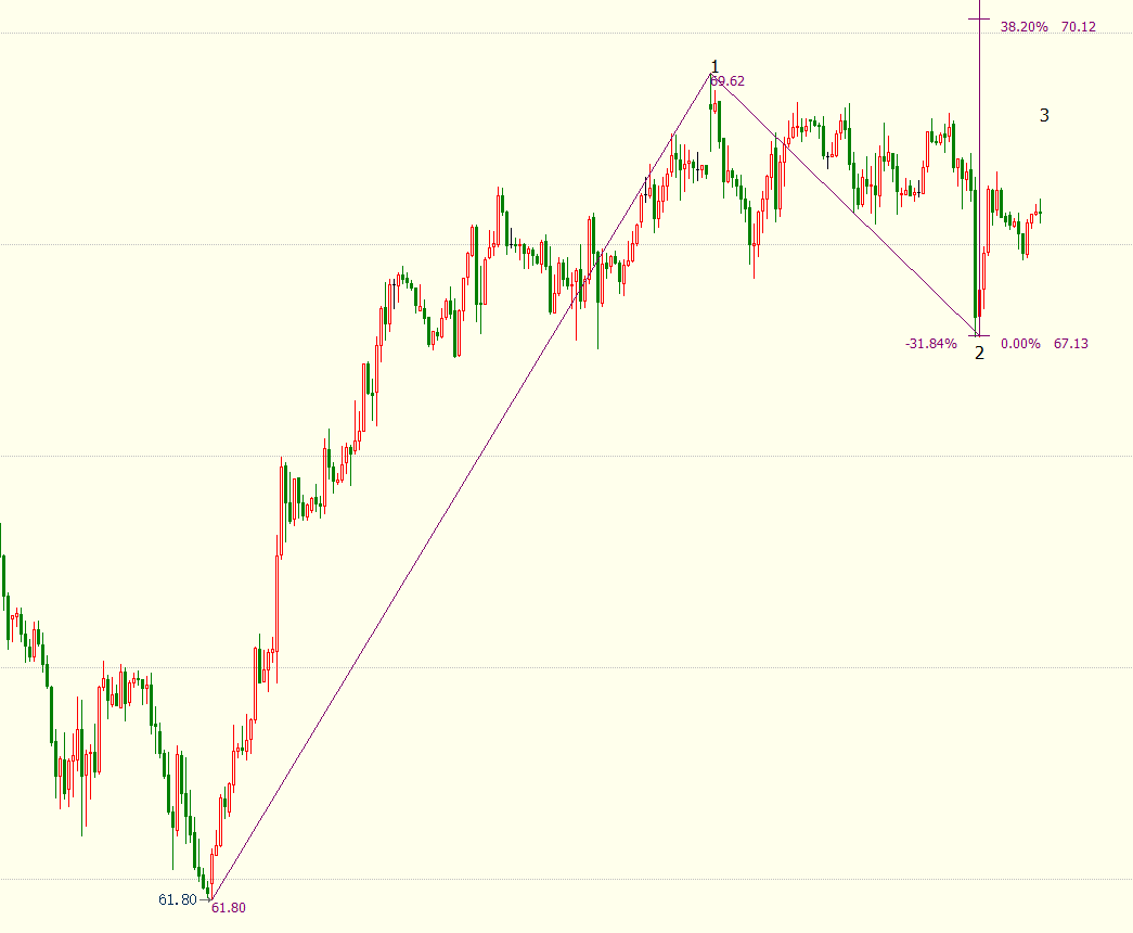 日线图上看,美油处于自61.74美元开启的上行((3))浪,上方近期目标看向14.6%目标位72.03美元。小时图上看,油价自67.13美元开启上行3浪走势,后市料升破38.2%目标位70.12美元,并进一步升向61.8%目标位71.96美元。
