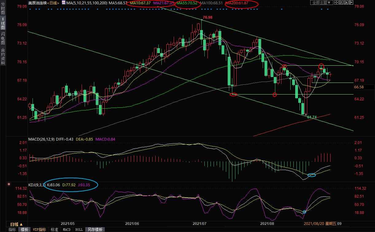 下方10日均线和21日均线支撑在67.35附近,如果失守该支撑,则增加短线看空信号,进一步支撑在7月20日低点65.01附近。