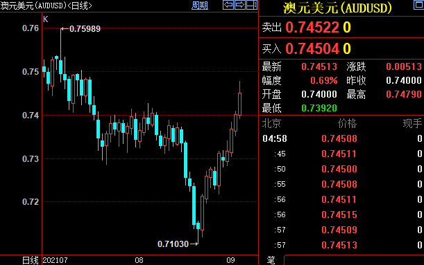 好在数据显示,澳洲第二季经济较前季增长0.7%,超过预估的0.5%。澳洲经济躲过技术性衰退,结合疫苗接种加快,让澳元多头松了一口气。西太平洋银行新西兰战略主管Imre Speizer说:“现阶段澳元应该恢复到0.75美元左右,我们的年底目标仍然是0.78美元。”