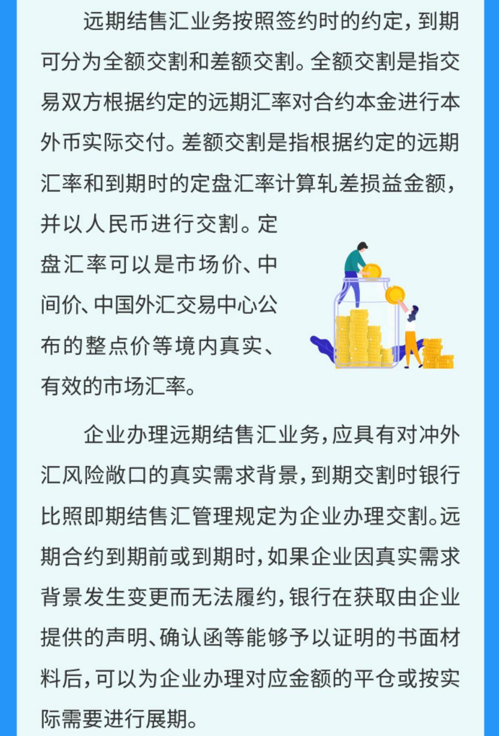 一张图:远期结售汇 别家企业这么做 2021-09-06 21:47 远期结售汇业务是指银行与企业约定在未来某一日期或某一时间段(期限大于两个工作日)以约定的价格、金额进行人民币与外币的兑换交易,其中远期结汇是企业将外汇卖给银行,远期售汇是企业向银行购买外汇……供稿:中国建设银行制作:国家外汇管理局江苏省分局