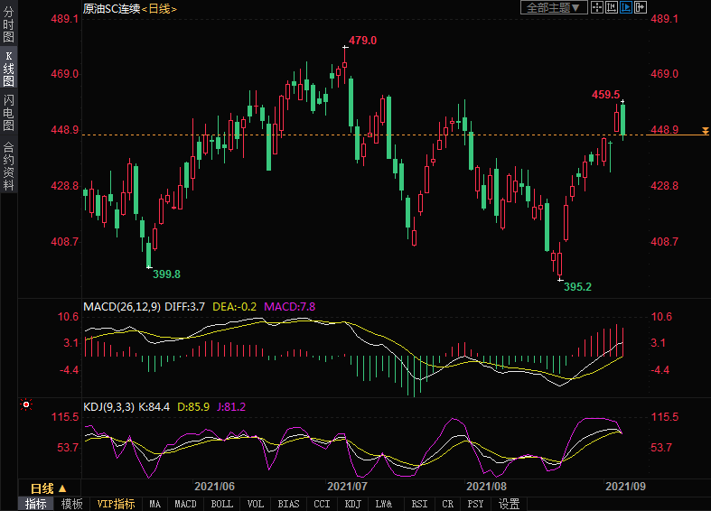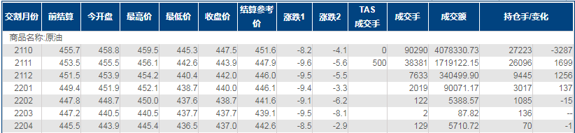 上海原油价格下跌,主力合约2110终盘收于447.5元/桶,跌8.2元/桶,跌幅1.8%。