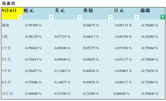 1周LIBOR:欧元报-0.58129%,美元报0.07325%,英镑报0.04013%,日元报-0.08350%,瑞郎报-0.82080%;