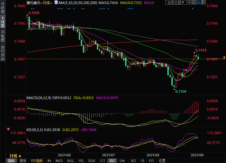 上方初步阻力关注9月3日高位0.7478,进一步关注100日均线0.7541及200日均线0.7607。