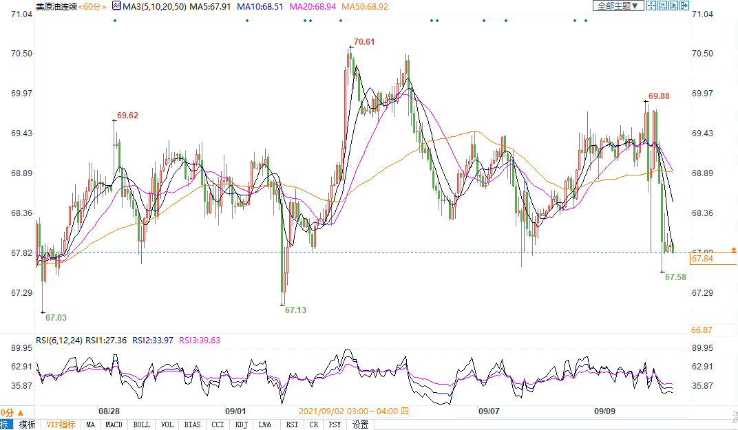 周四(9月9日)美油期货下跌1.16美元,跌幅为1.7%,结算价报68.14美元/桶;布油下跌1.15美元,跌幅为1.6%,报收71.45美元/桶。两大合约结算价均创8月26日以来最低。消费大国宣布将组织投放国家储备原油以缓解原材料价格上涨压力,油价承压;EIA数据显示,截至9月3日当周,原油库存下降152.8万桶,不及预期的475万桶,与此同时因投资者寻求更安全资产,美国国债上涨,这给石油市场造成严重恐慌。