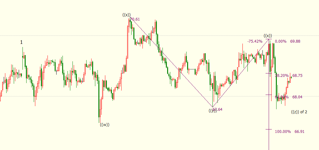 日线图上看,美油处于自61.74美元开启的上行((3))浪,上方近期目标看向14.6%目标位72.03美元。小时图上看,油价处于自69.88美元开启的下行((z))浪,料重新跌破68.04美元,并进一步下探66.91美元。((z))浪是自69.62美元开启调整2浪的子浪。