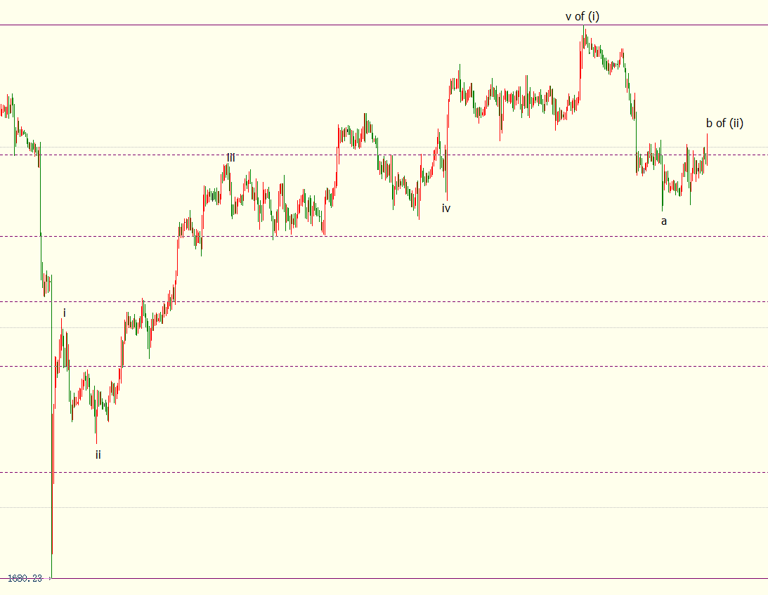 小时图上看,金价自1782美元开启反弹b浪,但b浪料随时终结,并开启下行c浪走势。b浪是自1834美元开启的下行(ii)浪的子浪。金价后市料跌破(i)浪(1680-1834美元)38.2%回档位1775美元,并进一步下探50%回档位1757美元。(i)浪和(ii)浪是自1680美元开启的上行((i))浪的子浪。