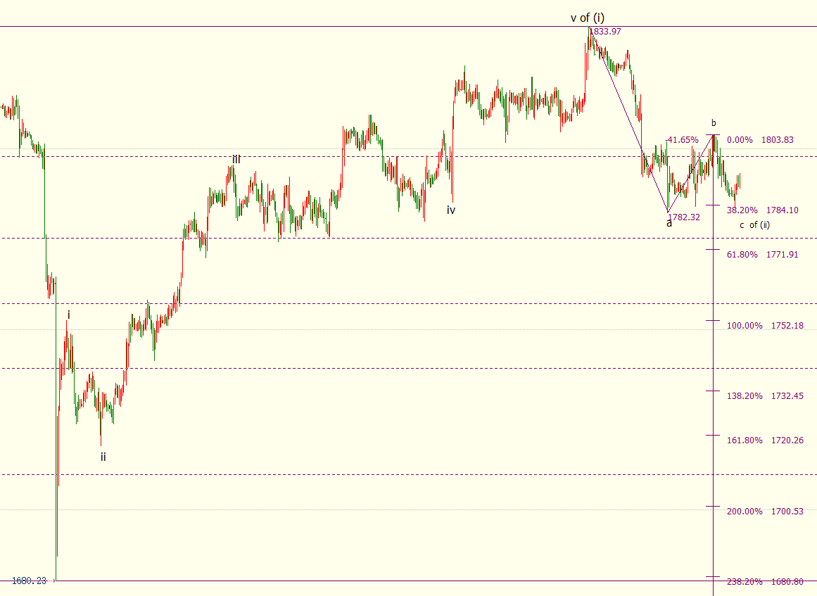 小时图上看,金价自1804开启下行c浪走势,触及38.2%目标位1784美元,后市料下探61.8%目标位1772美元。c浪是自1834美元开启的下行(ii)浪的子浪。金价后市料进一步下探(i)浪(1680-1834美元)50%回档位1757美元。(i)浪和(ii)浪是自1680美元开启的上行((i))浪的子浪。
