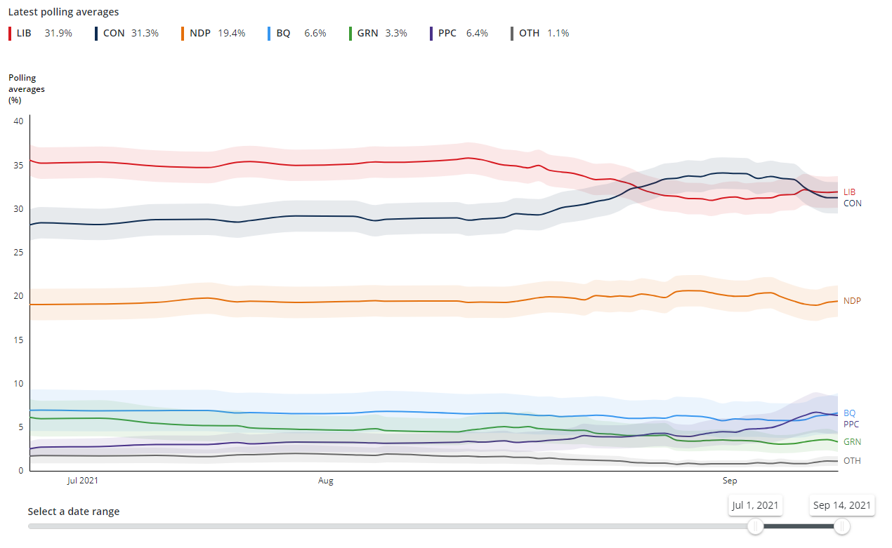 最近的民意调查显示自由党略微领先,在最近的民意调查中,自由党的平均支持率为31.9%。紧随其后的是保守党,平均支持率为31.3,而新民主党的支持率为19.4%。