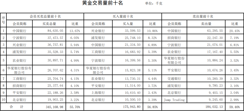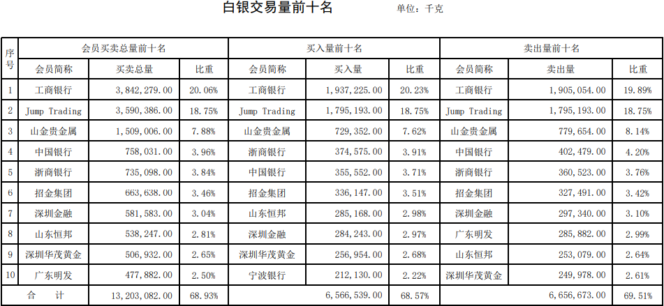 白银交易方面,工商银行位居榜首,成交比重19.37%升至20.06%,量化交易机构Jump Trading排名第二,成交占比从19.39%跌至18.75%。
