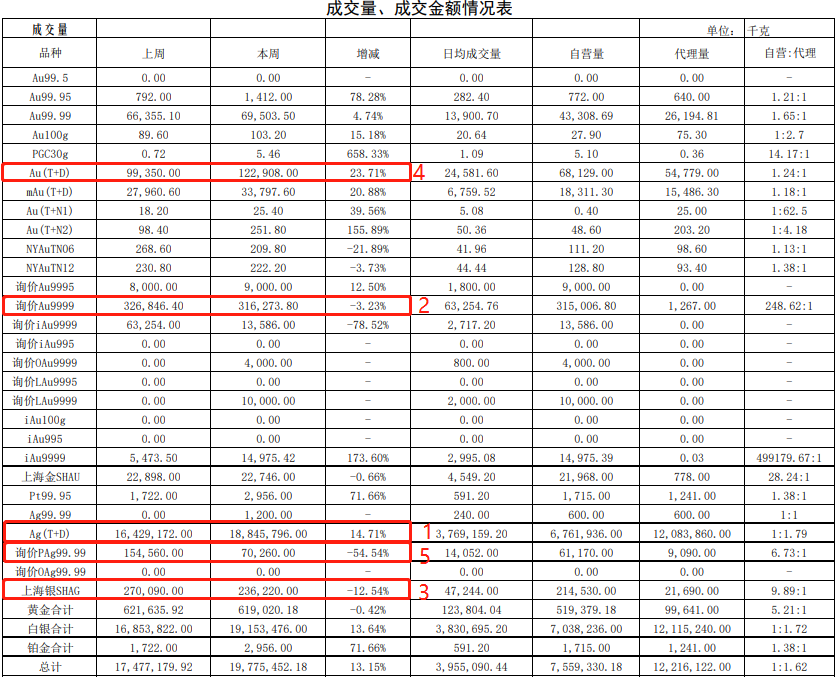 上周成交量:黄金下跌0.42%,白银上涨13.64%,铂金上涨71.66%。