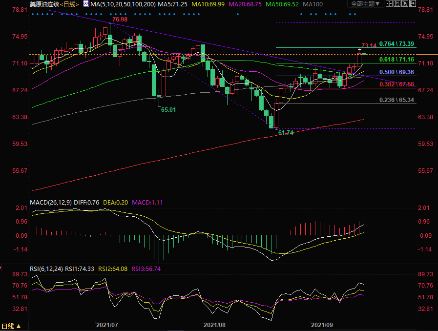 技术面来看,油价强势突破61.8%回撤位,且站上各周期均线上方,格局偏多,有望进一步上涨,不过RSI显示油价有超买之忧,暗示油价上方空间或已不大。