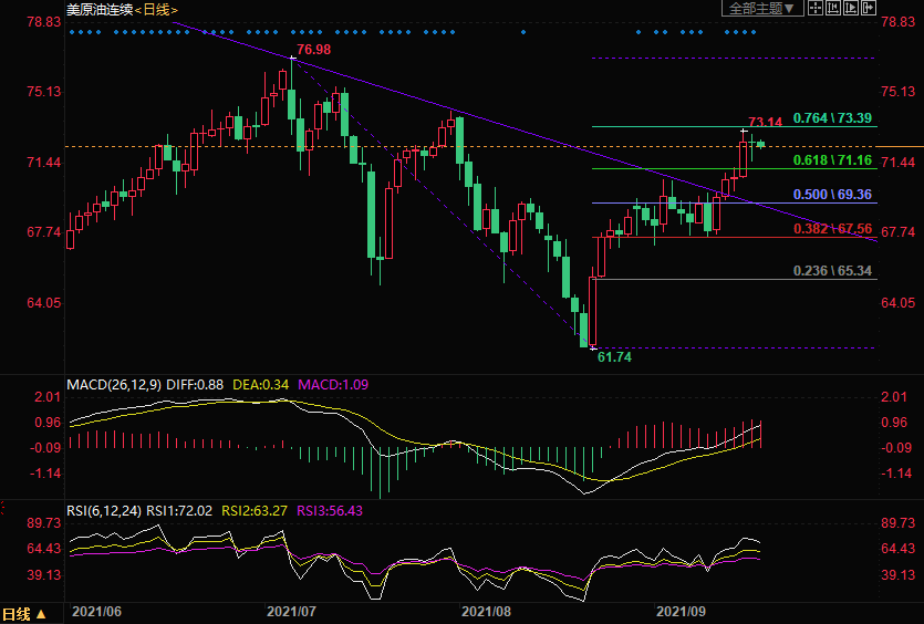 上方阻力关注76.4%回撤位73.39,进一步关注7月30日高位74.23以及7月13日高位75.51。