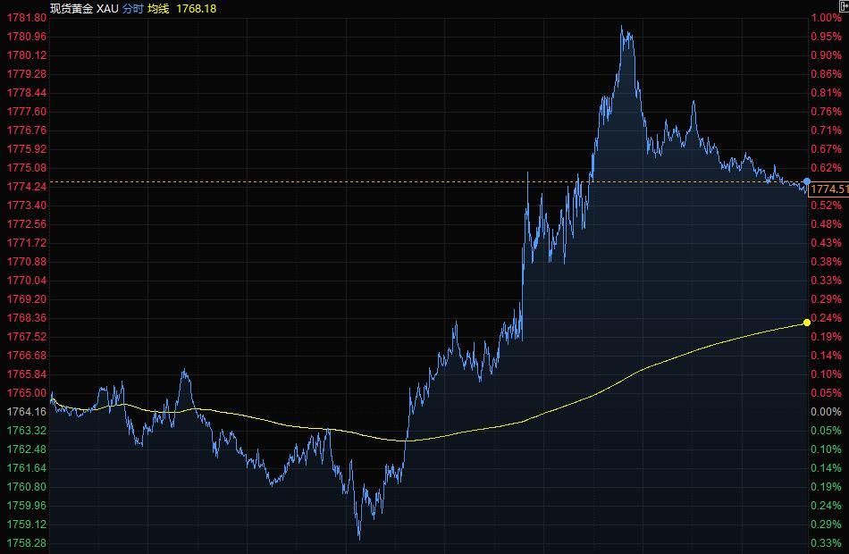 现货黄金周二尾盘涨超10美元,收报1774.51美元/盎司,对全球经济增长的担忧刺激避险买盘,美联储会议周三结束时可能会为削减经济刺激的时间表提供线索。