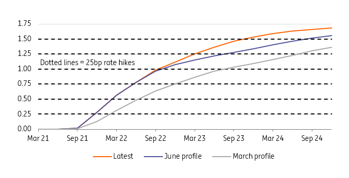 但与以往一样,更大的焦点是接下来会发生什么,重要的是,最新的利率预测意味着,到2022年底,该行还将加息三到四次。这与挪威央行6月份的预测相当相似,不过更大的不同是,政策制定者考虑到2023年将再收紧约20个基点。