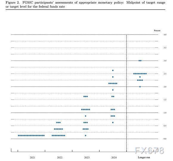美联储决策者的预期中值为2024年底的联邦基金利率为1.8%,仍然低于2.5%的水平,他们认为,从长期来看,2.5%的水平既不会刺激也不会限制经济增长。尽管决策者预测到2024年前通胀率都将高于美联储2%的目标。