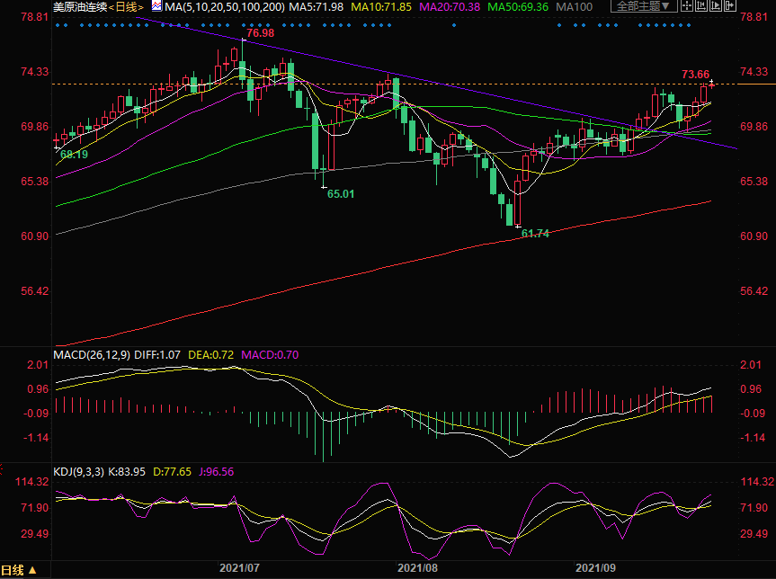 日线级别:油价周四实现三连涨,创8月初以来新高,风险情绪与库存下降等因素持续推升油价。