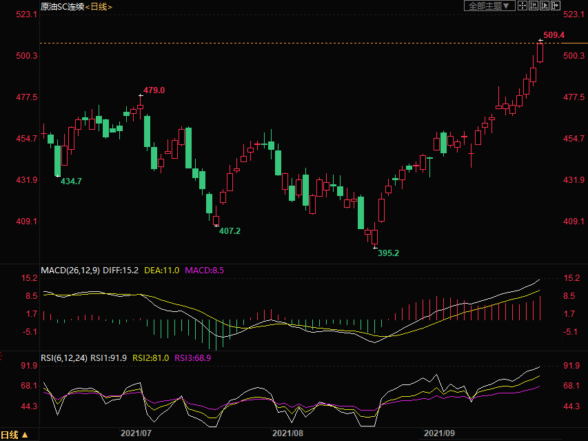上海原油价格上涨,刷新20个月新高,主力合约2111终盘收于507.6元/桶,涨15.4元/桶,涨幅3.13%。