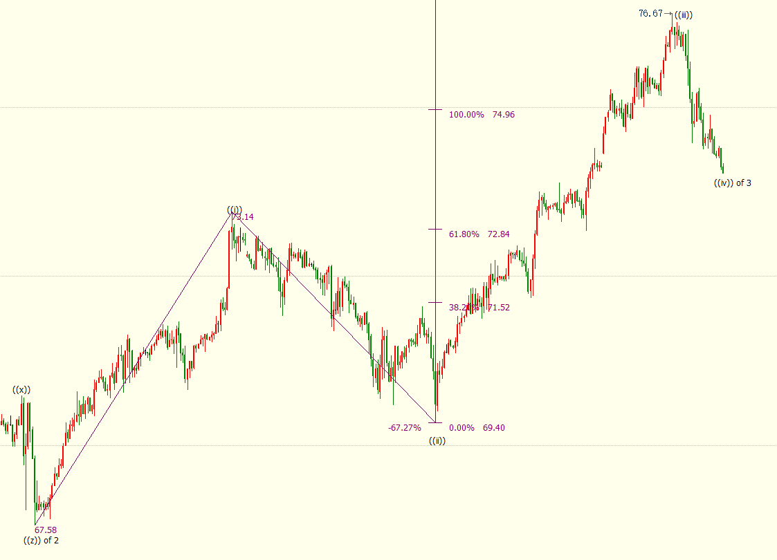 日线图上看,美油处于自61.74美元开启的上行((3))浪,上方近期阻力看向23.6%目标位78.37美元。小时图上看,油价处于自76.67美元开启的下行((iv))浪,((iv))料在73.14美元上方寻获支撑。(iv)浪是自67.58美元开启的上行3浪的子浪。