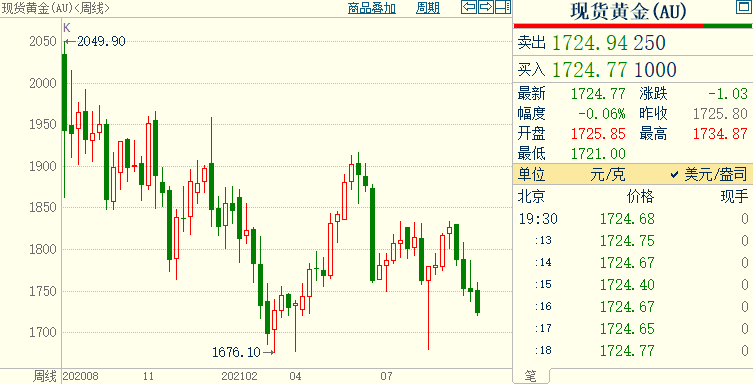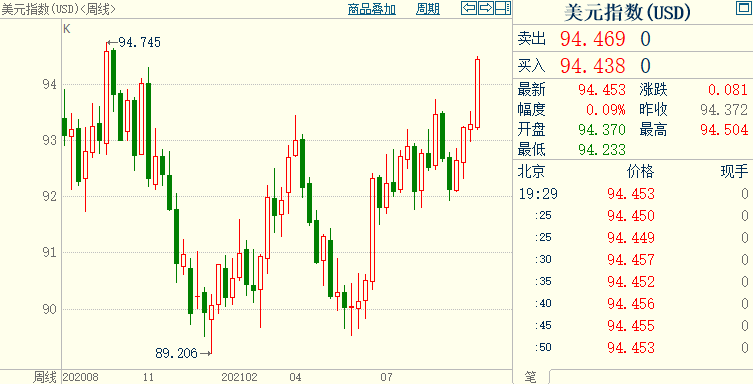 北京时间9月30日19:26,现货黄金累计下跌4.9%至1724.86美元/盎司;美元指数累计上涨1.26%至94.453。金价本月创下8月10日以来新低至1721.76美元/盎司,美元指数升至2020年9月28日以来新高至94.504。