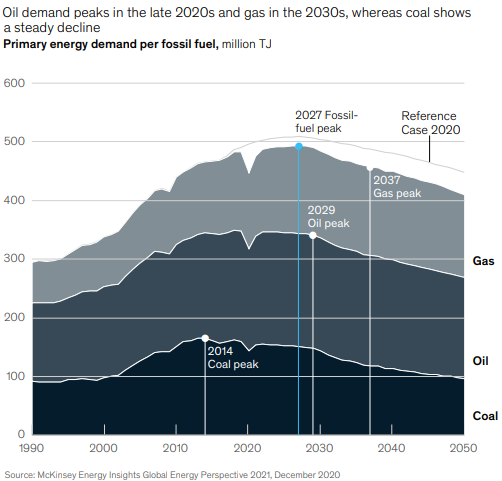 OPEC对石油需求上升给出了最强劲的预测,将恢复日期定在2022年第二季度。在更遥远的未来,由于多数预测者预计,化石燃料需求将在未来20年内达到峰值(如下图),而国际能源署也建议,为确保净零排放不要新建项目,更大的供应缺口可能引发更多的价格冲击。