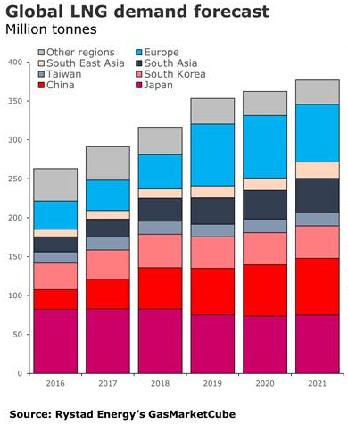 Rystad Energy列出全球不同地区对液化天然气需求的预测