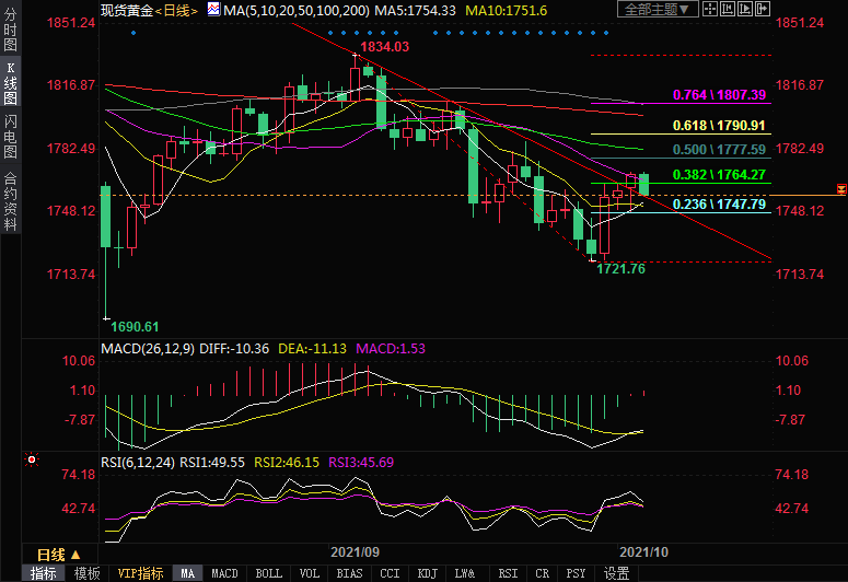 技术面来看,MACD金叉,RSI在50附近运行,也显示格局整体偏多,但在美联储11月即将缩减QE的大背景下,黄金上方的空间可能受限。
