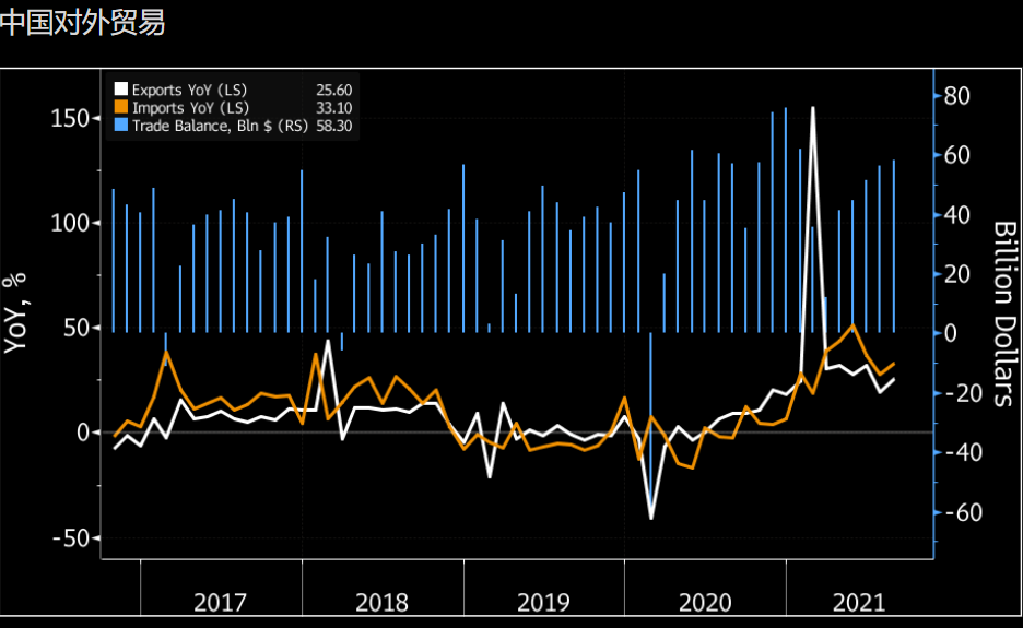 彭博经济研究预测,出口同比增长18.0%,增幅低于8月的25.6%。一年前比较基数较高以及电力短缺影响可能导致出口增速放缓。