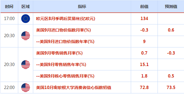 周五亚欧时段市场相对数据较少,主要关注纽约时段的美国9月零售销售数据,该数据因为对行情的影响较大,市场关注度较高,有着“恐怖数据”的俗称,投资者需要重点关注。
