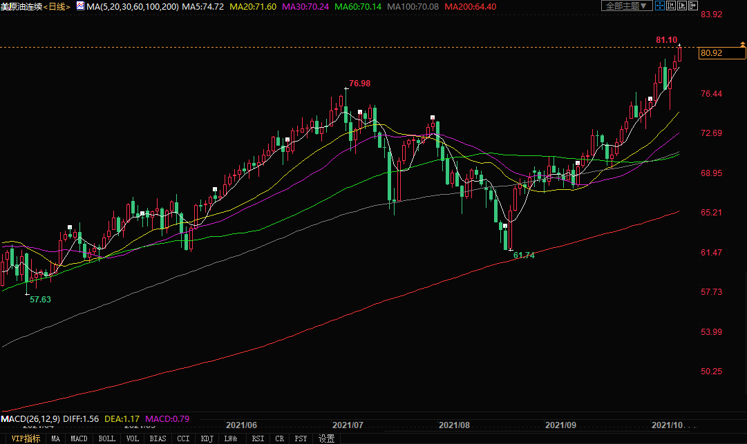 随着冬季逐渐接近,全球能源危机尚未得到有效解决,且逐渐蔓延波更多国家。周一(10月11日)美原油一度涨至81.10美元/桶创下近七年新高。