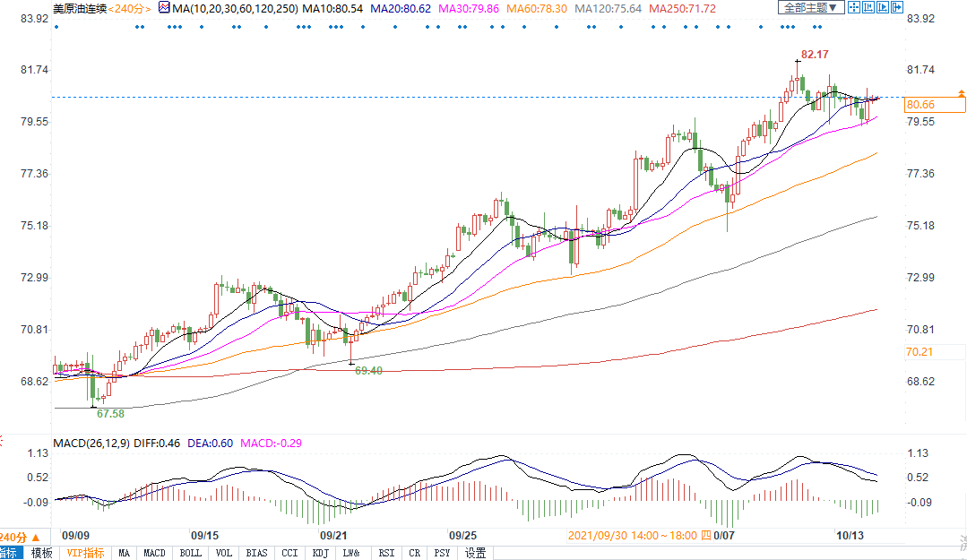 周三(10月13日)美油期货下跌0.2美元,跌幅为0.3%,结算价报80.44美元/桶。布油下跌0.24美元,跌幅为0.3%,报收83.18美元/桶。OPEC在月度市场报告中下调2021年全球石油消费量预测,该组织表示,虽然天然气价格飙升可能会提高发电等一些领域的石油使用量,但也可能抑制包括炼油在内其它领域的需求,油价盘中一度走低至近两日低点。