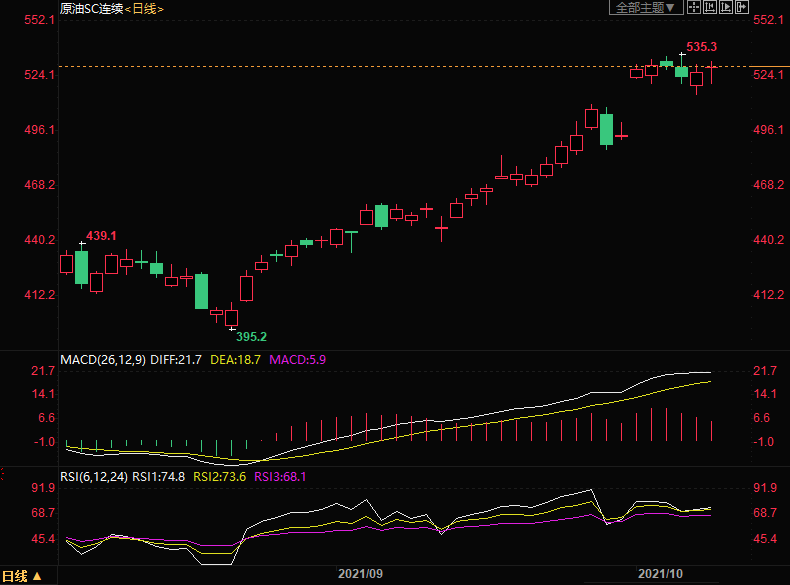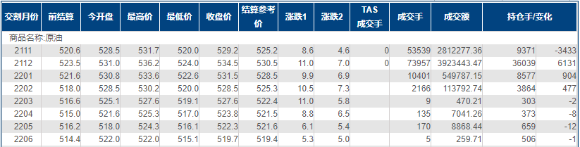 上海原油价格上涨,刷新三年高位,主力合约2112终盘收于534.5元/桶,涨11元/桶,涨幅2.1%。