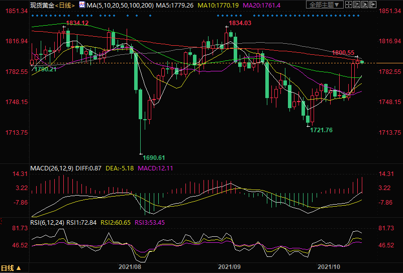 周五(10月15日)现货黄金小幅下跌,短线金价承压于1800一线下方,日内可能拐头下行,建议保守者观望,激进者逢高轻仓做空。