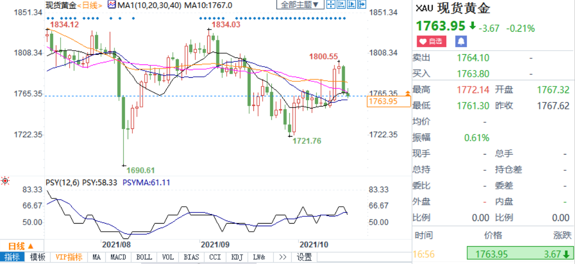 北京时间16:57,国际现货黄金价格报1763.69美元/盎司,跌0.23%。
